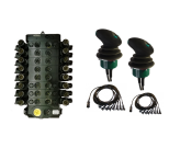 Paketet innehåller en elförstörd ventil med 6 proportionalfunktioner + 2 on-off funktioner till skogskran (flöde 150 l/min), två joystickar och styrkablar.